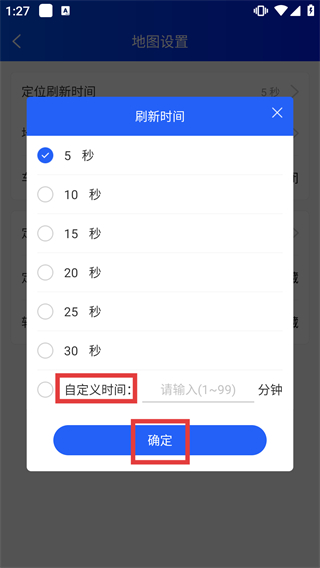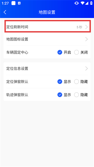 3、在【地圖設置】頁面,點擊【定位刷新時間】選項,會彈出對應的時間配置彈窗,當前默認時長為5秒。