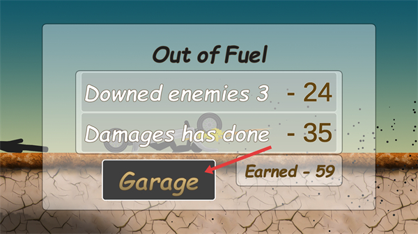 4、燃油耗盡會(huì)顯示【Out-of-Fuel】,結(jié)算時(shí)可查看【Downed-enemies-3-24】等數(shù)據(jù),點(diǎn)擊【Garage】返回改裝戰(zhàn)車。