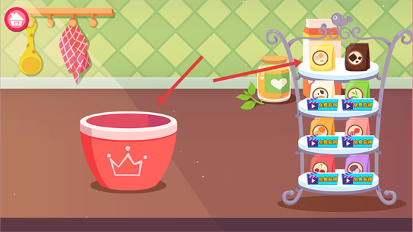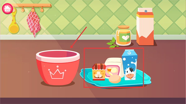 3、選取托盤上的【糖】【黃油】【牛奶】等食材,將其添加到左側(cè)的容器中。