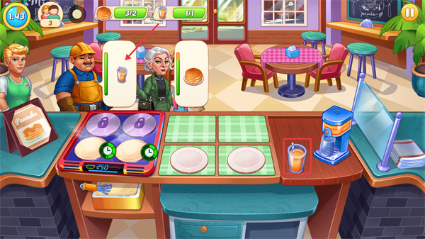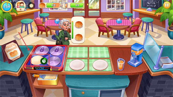 1、在制作【Pancake】的界面,先在煎盤制作煎餅,需留意進(jìn)度條【1/2】的完成狀態(tài),及時(shí)供應(yīng)顧客需求。