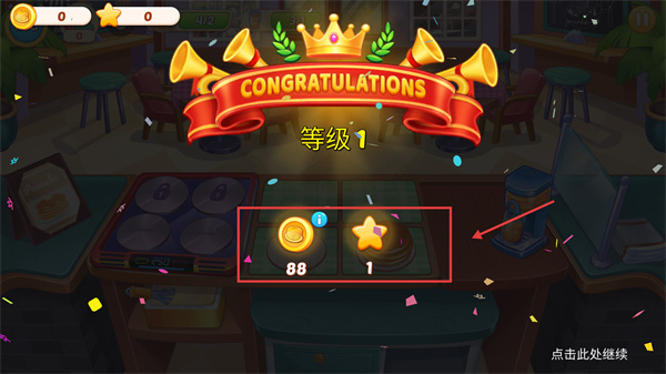 3、通關(guān)后可獲得【88金幣】與【1星星】獎(jiǎng)勵(lì),點(diǎn)擊“點(diǎn)擊此處繼續(xù)”進(jìn)入下一環(huán)節(jié)。