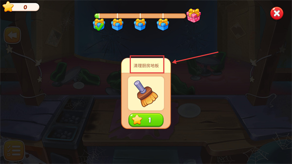 4、解鎖新任務(wù)【清理廚房地板】,消耗1星星即可使用掃帚道具完成該場(chǎng)景的清潔任務(wù)。