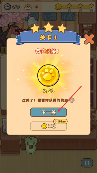4、完成關(guān)卡1的所有任務后,彈出通關(guān)界面,點擊“下一關(guān)”按鈕,進入后續(xù)的關(guān)卡挑戰(zhàn)。