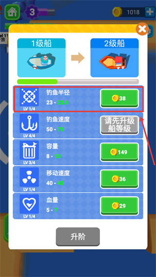 4、在升級界面消耗資源提升【1級船】的【釣魚半徑】,部分屬性升級需先完成船只等階提升。