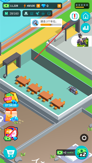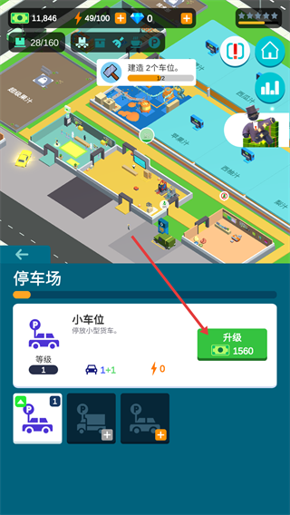 3、進入停車場界面后,點擊小車位的“升級”按鈕,消耗對應(yīng)游戲貨幣。