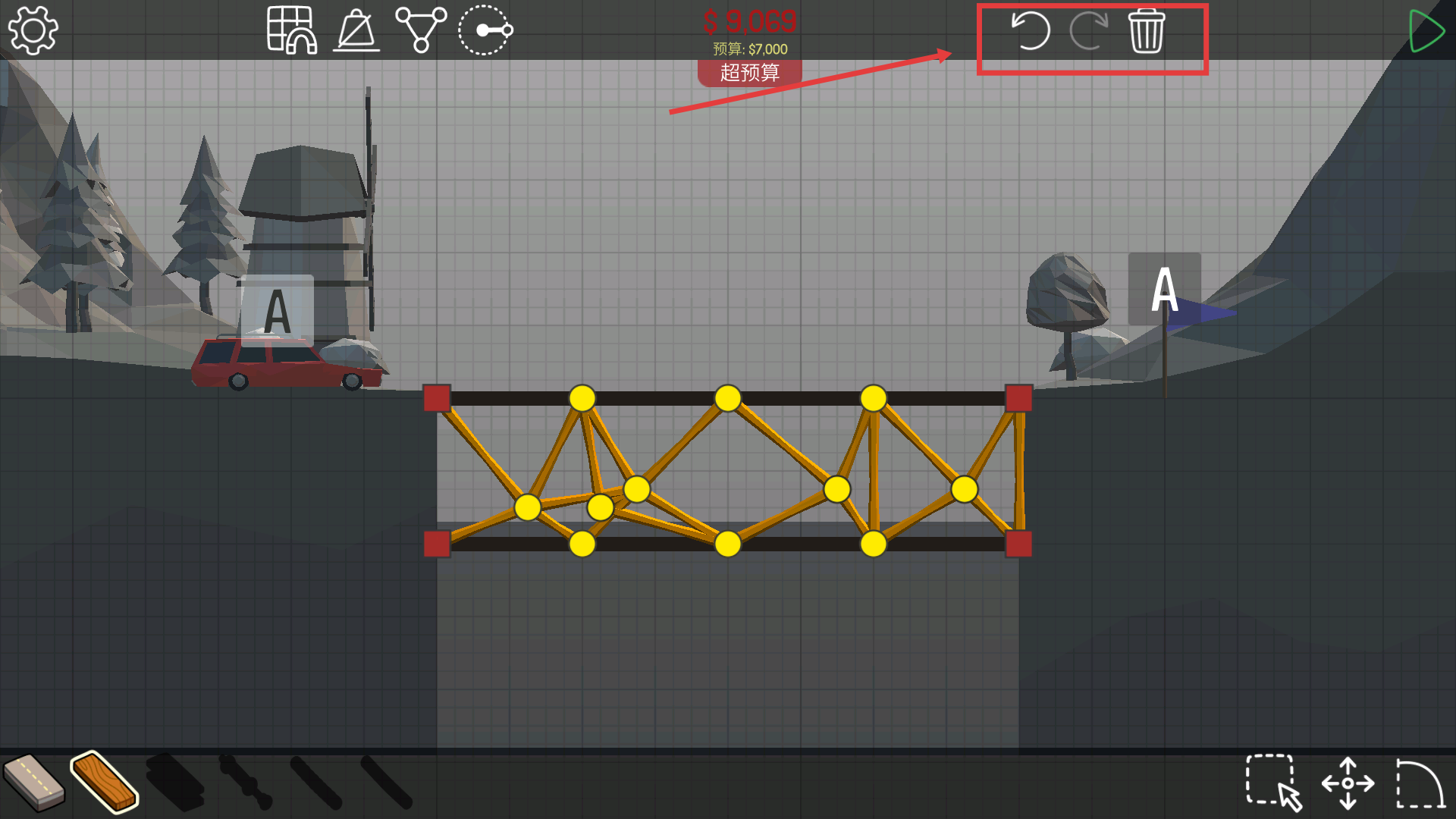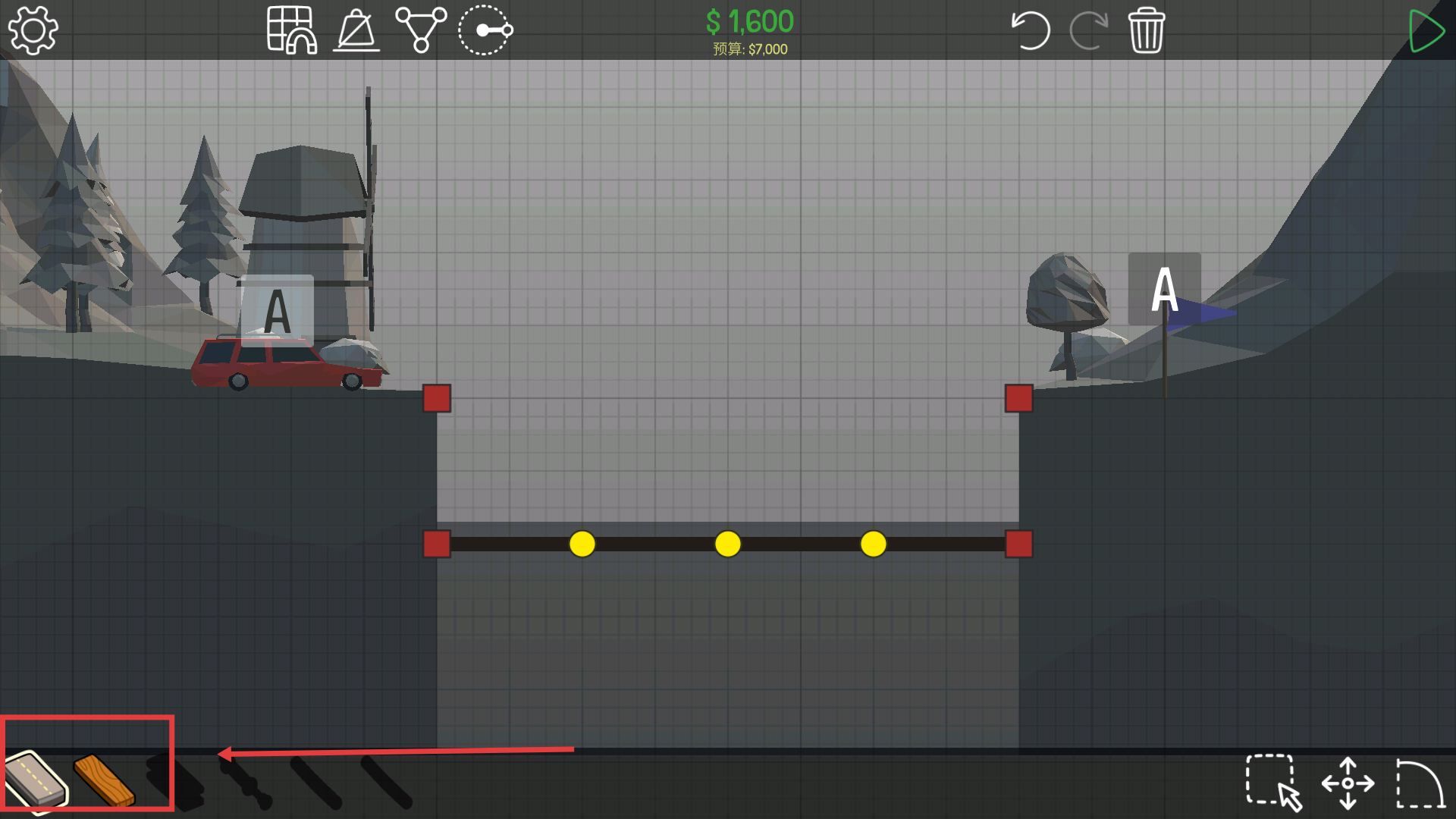 1、開局需在【A】與【A】兩地間建橋,利用左下角材料欄圖標選擇合適材料搭建。