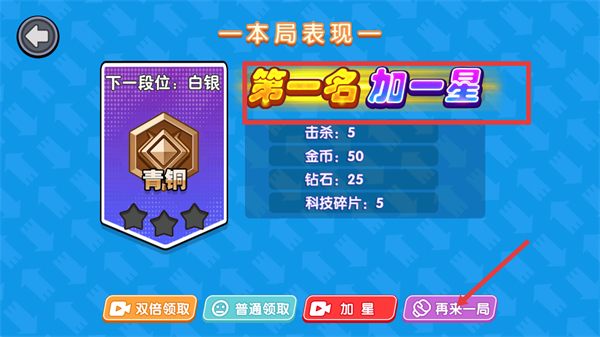 4、若成功存活到最后獲得【第一名】,可加一星提升段位,還能獲取【金幣】【鉆石】等獎勵解鎖新內(nèi)容。