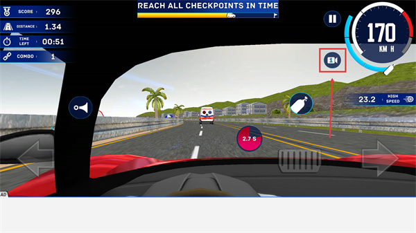 3、紅框內(nèi)按鈕可以切換第一人稱與第三人稱視角,同時(shí)關(guān)注車輛前方的障礙物及時(shí)避讓。