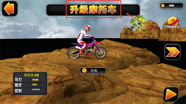 4、進入【升級摩托車】界面后,可消耗金幣提升車輛的馬力、穩(wěn)定等屬性,增強通關(guān)能力。