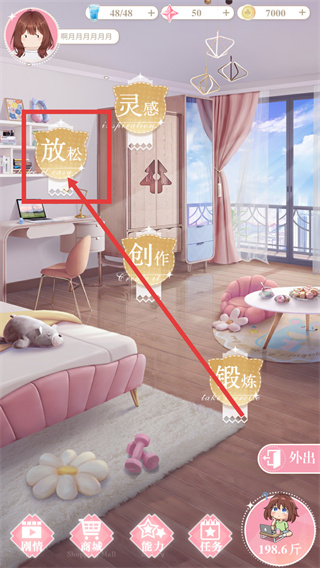 1、進入游戲主界面,可選擇【放松】等功能,通過對應(yīng)操作提升健康或?qū)懽鲗傩?,推進減肥與事業(yè)養(yǎng)成。