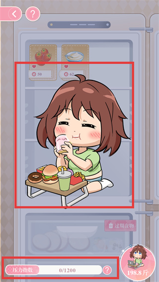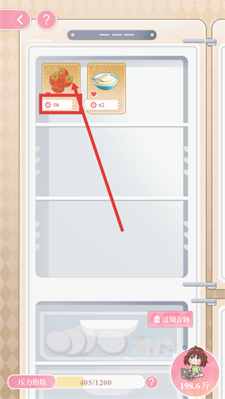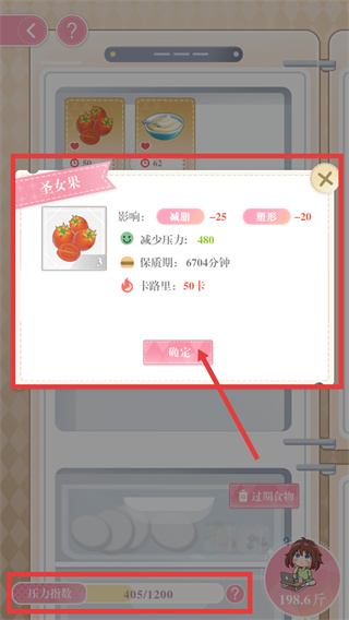 2、打開冰箱界面,選擇【番茄】這類低卡食物,補充饑餓值的同時助力減肥,合理搭配飲食控制體重變化。