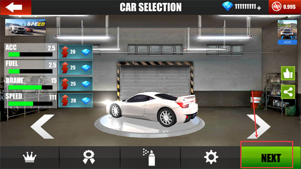 1、在【CAR-SELECTION】界面,可查看車輛的【ACC】【FUEL】等屬性,點擊【NEXT】按鈕可進(jìn)入關(guān)卡。
