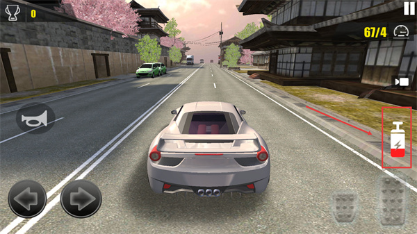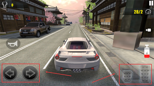 2、進(jìn)入駕駛場景后,通過左側(cè)【←】【→】按鈕控制車輛轉(zhuǎn)向,右側(cè)踏板類按鈕控制油門、剎車,躲避道路車輛推進(jìn)關(guān)卡。